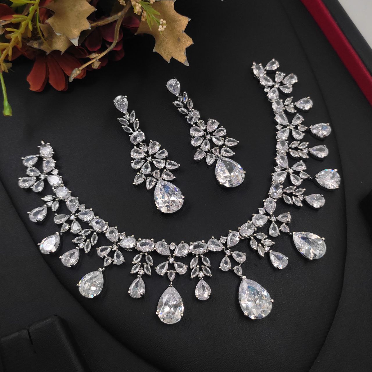 Bollywood Style Indian 925 Silver Plated Bridal CZ Necklace Earrings Jewelry Set